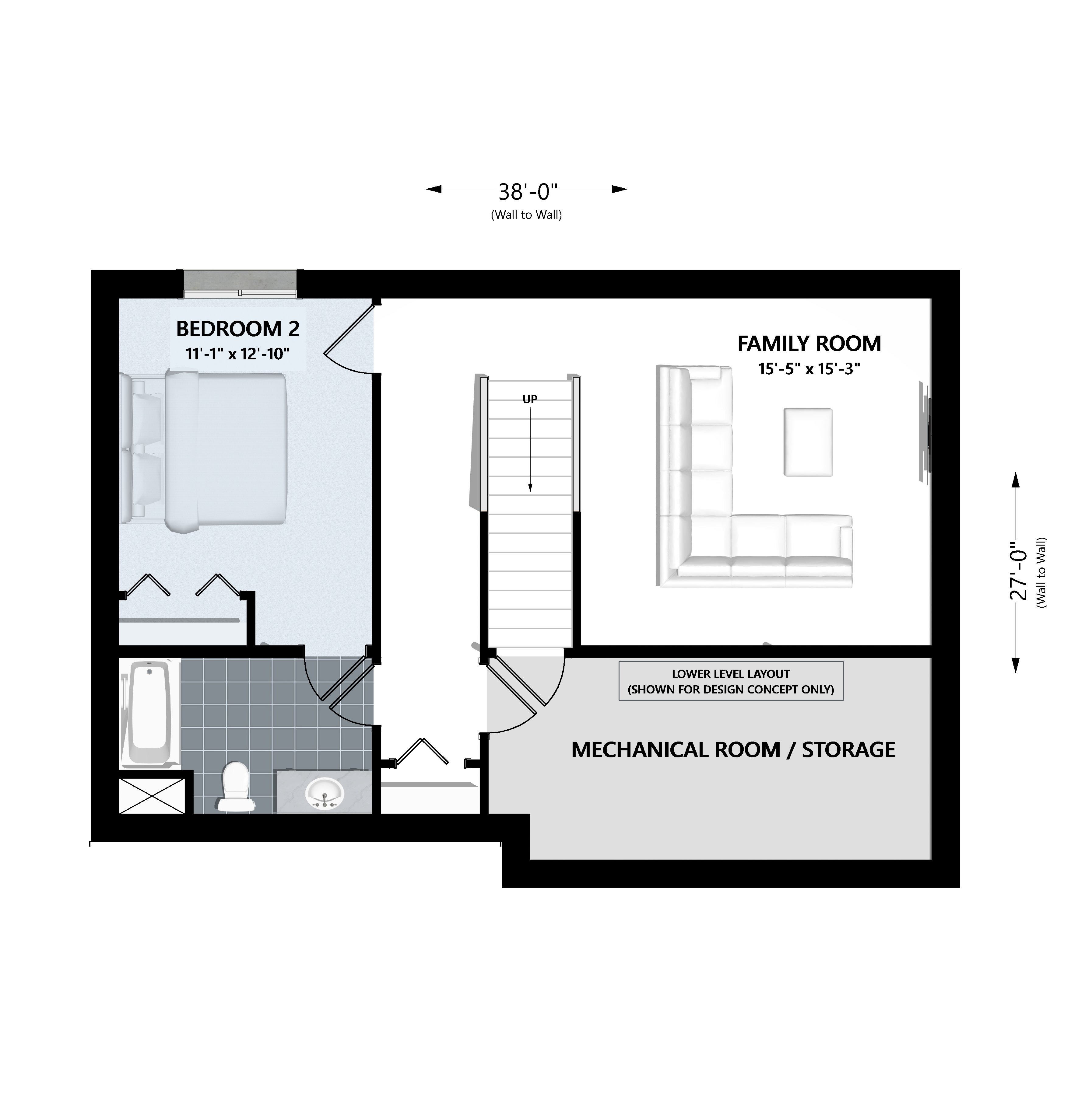 For homeowners who want the option to expand over time, the Moonstone offers flexible additions. An optional 300-square-foot main-level expansion extends the right side of the home, adding a second bedroom with a walk-in closet and a full bathroom. An optional finished lower level adds 820 square feet of additional living space, including a family room, an extra bedroom, a full bathroom, and mechanical/storage space — ideal for guests, hobbies, or growing families.